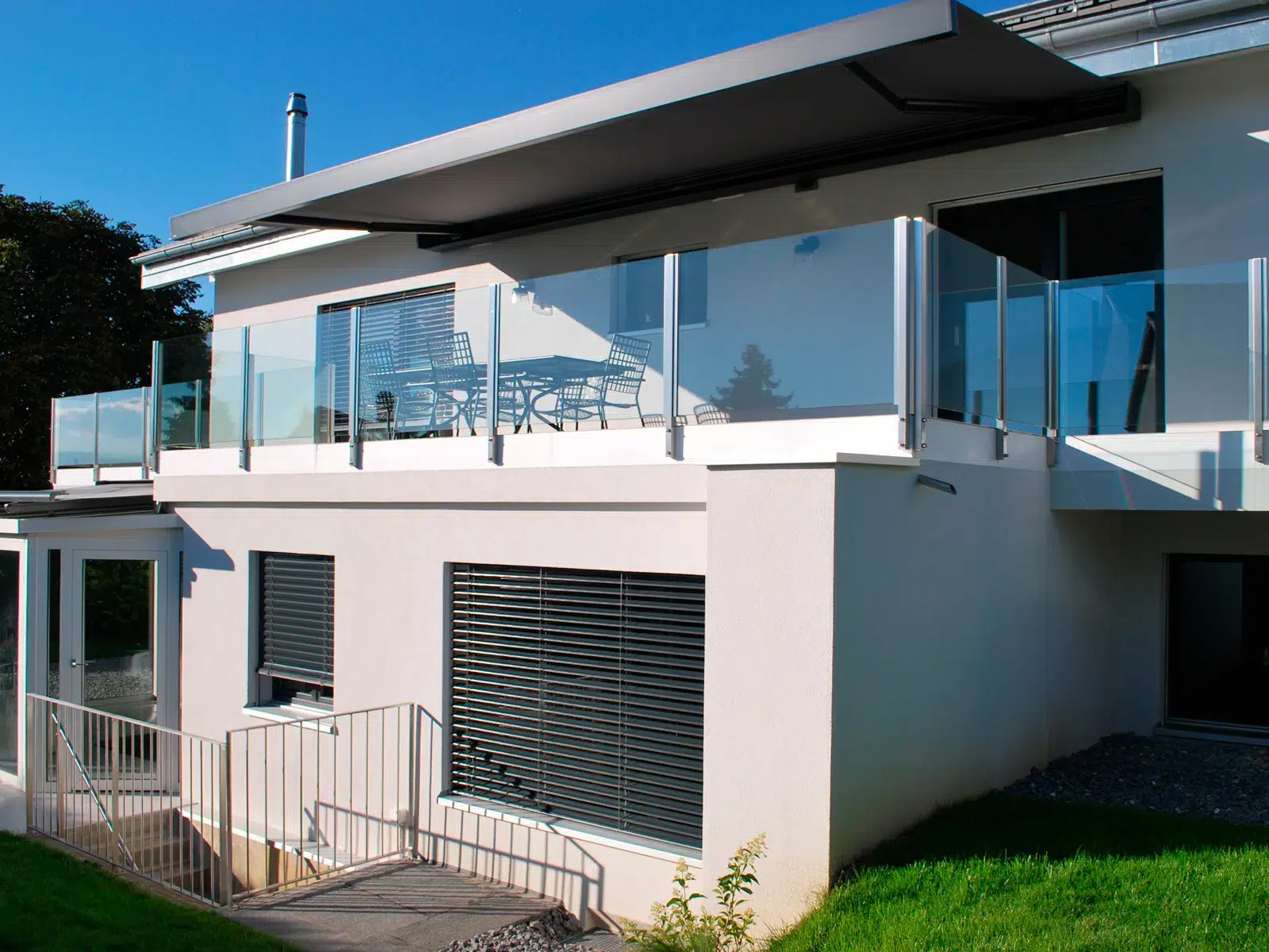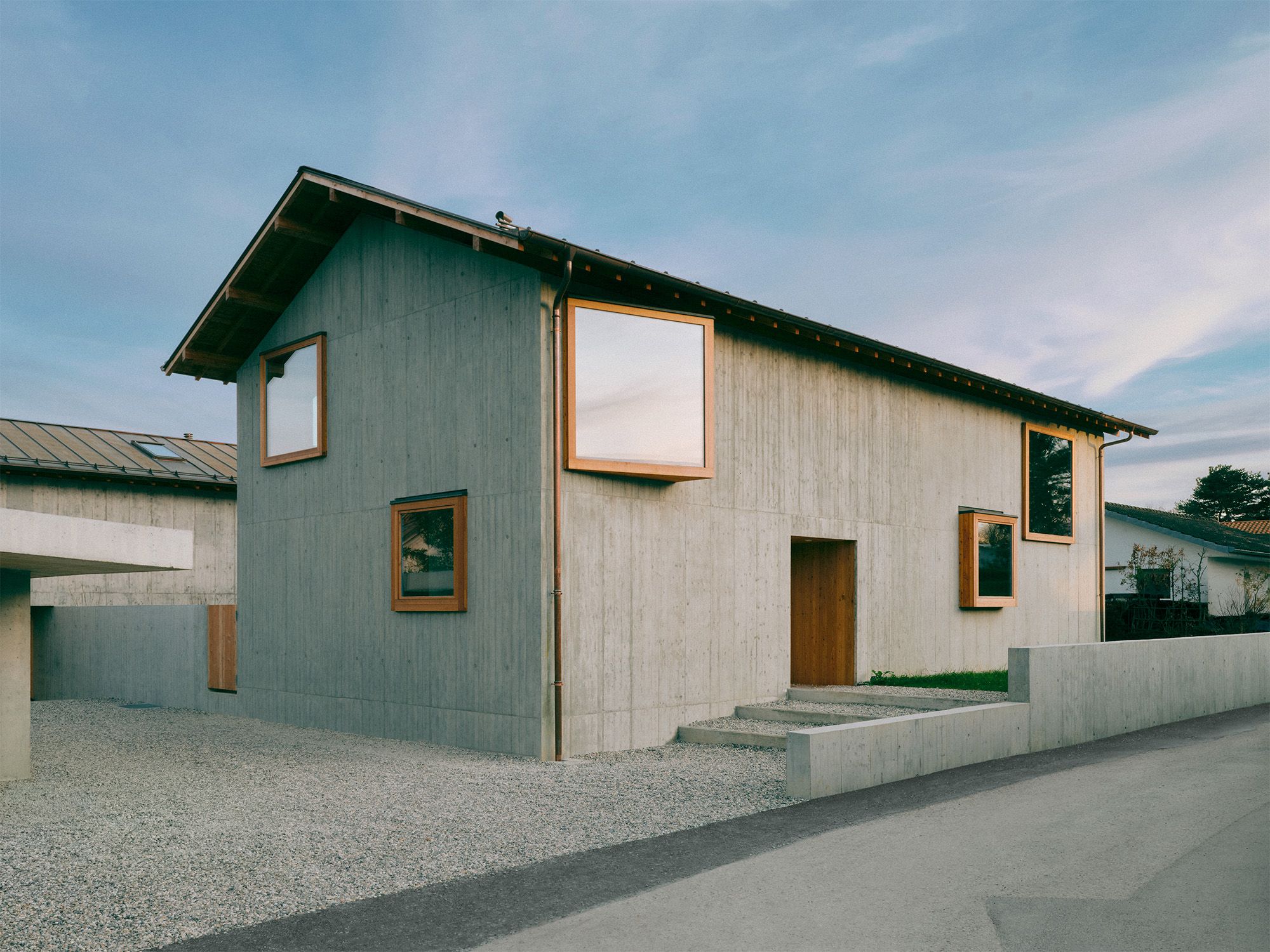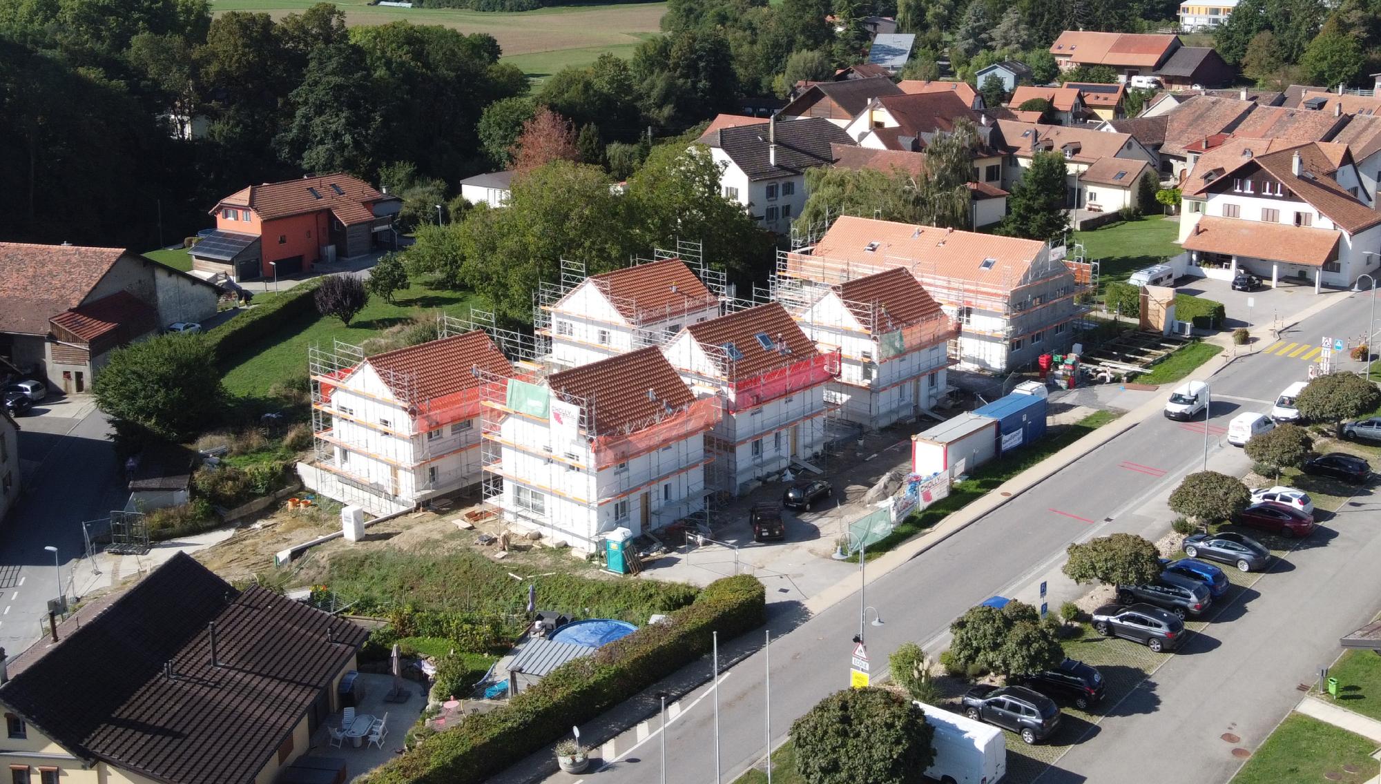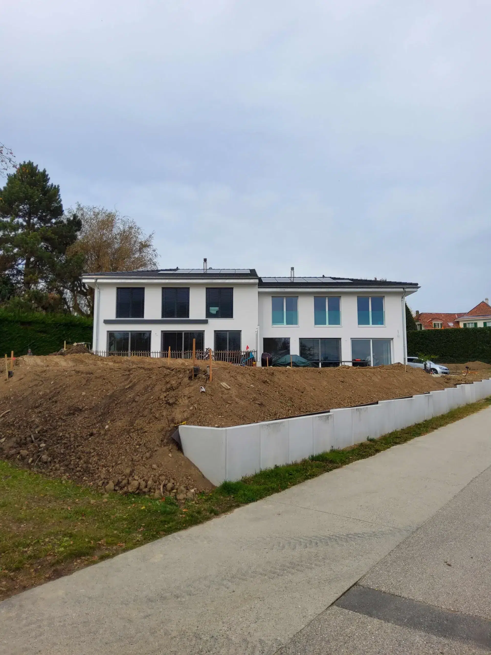 façade principale Vue d’ensemble du projet Minergie-P à Crans-près-Céligny, deux villas mitoyennes contemporaines réalisées avec des finitions de qualité.