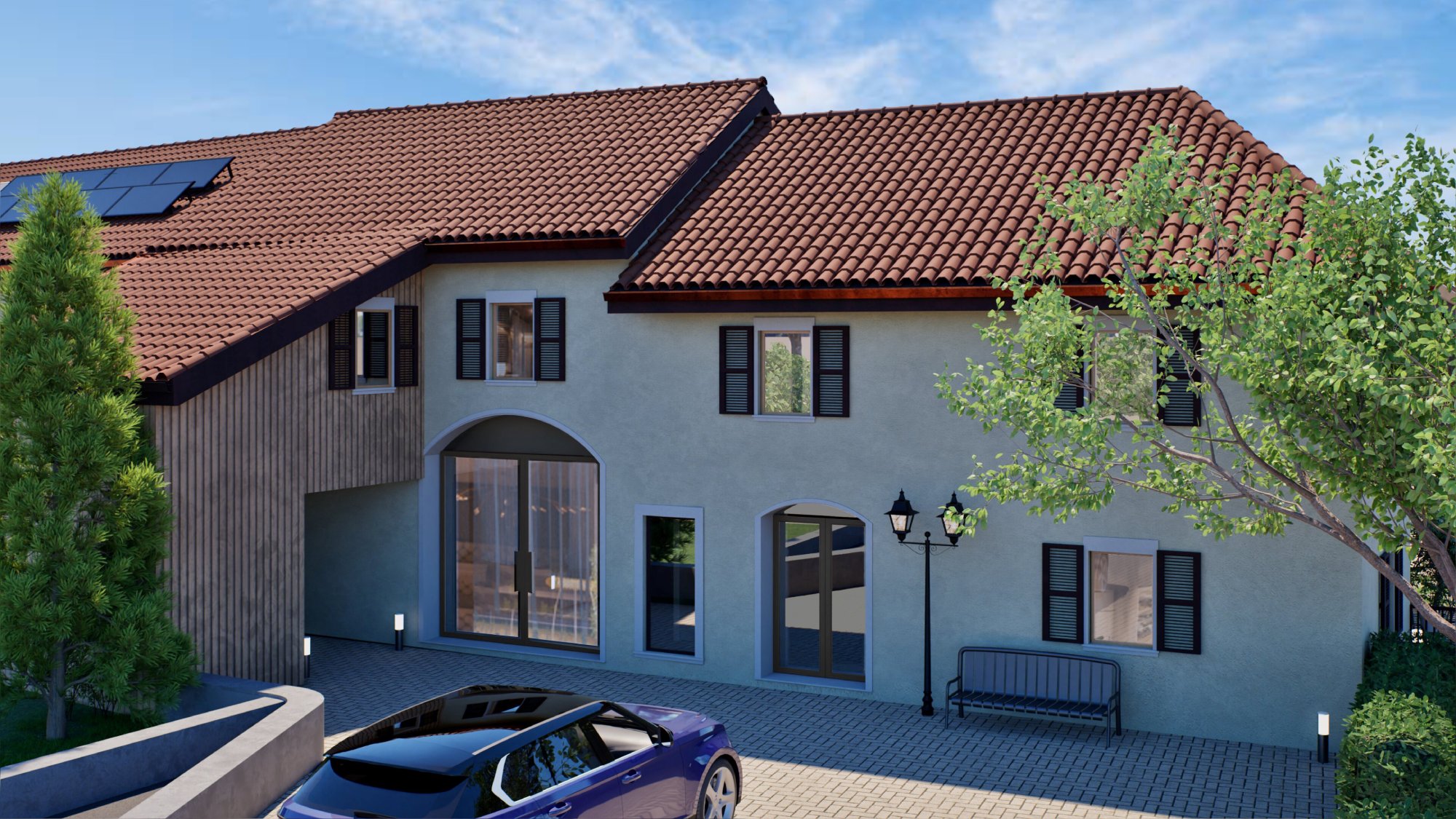 L’architecture extérieure s’inspire du style villageois local, tandis que les intérieurs offrent un confort moderne et lumineux.