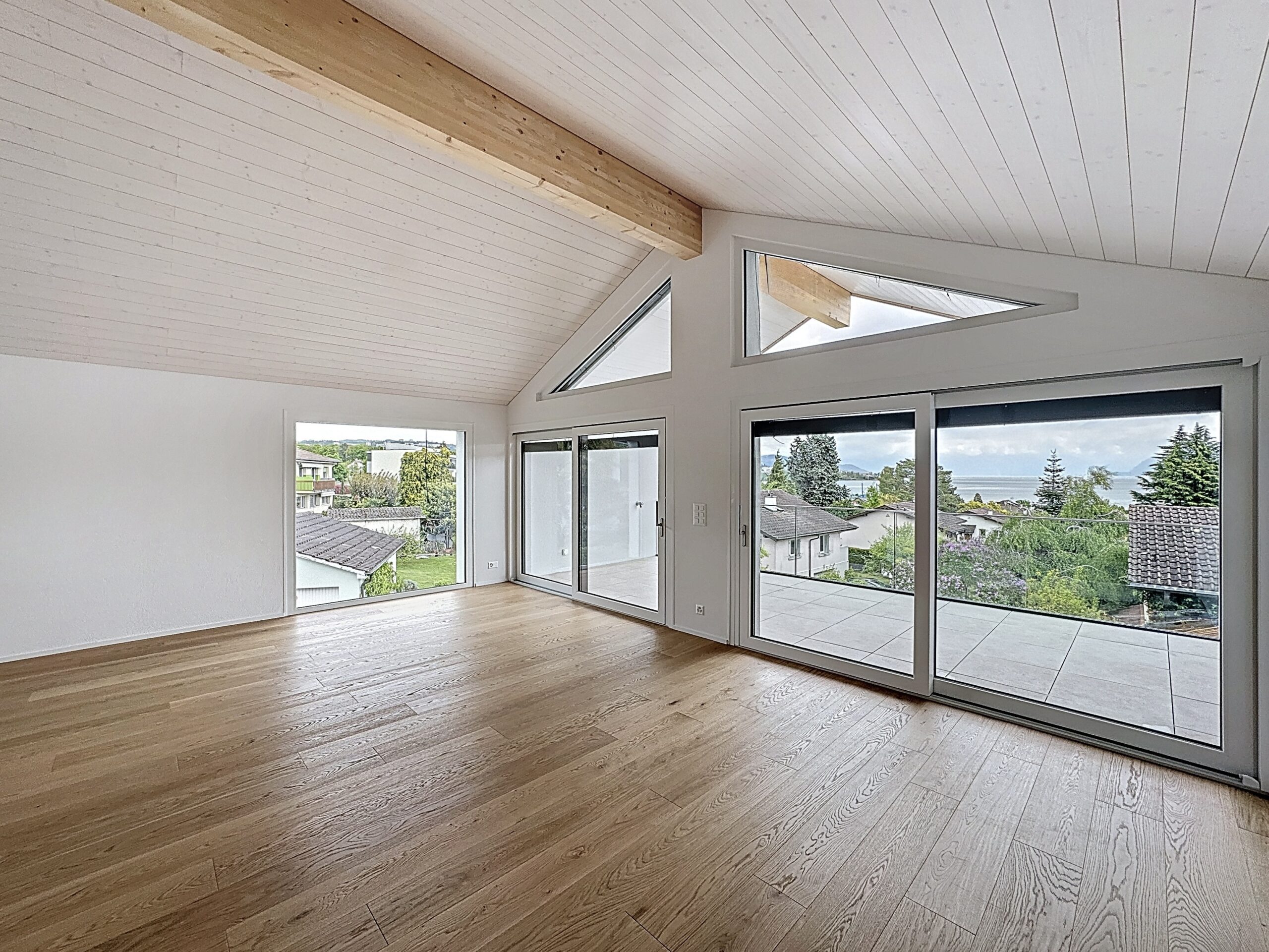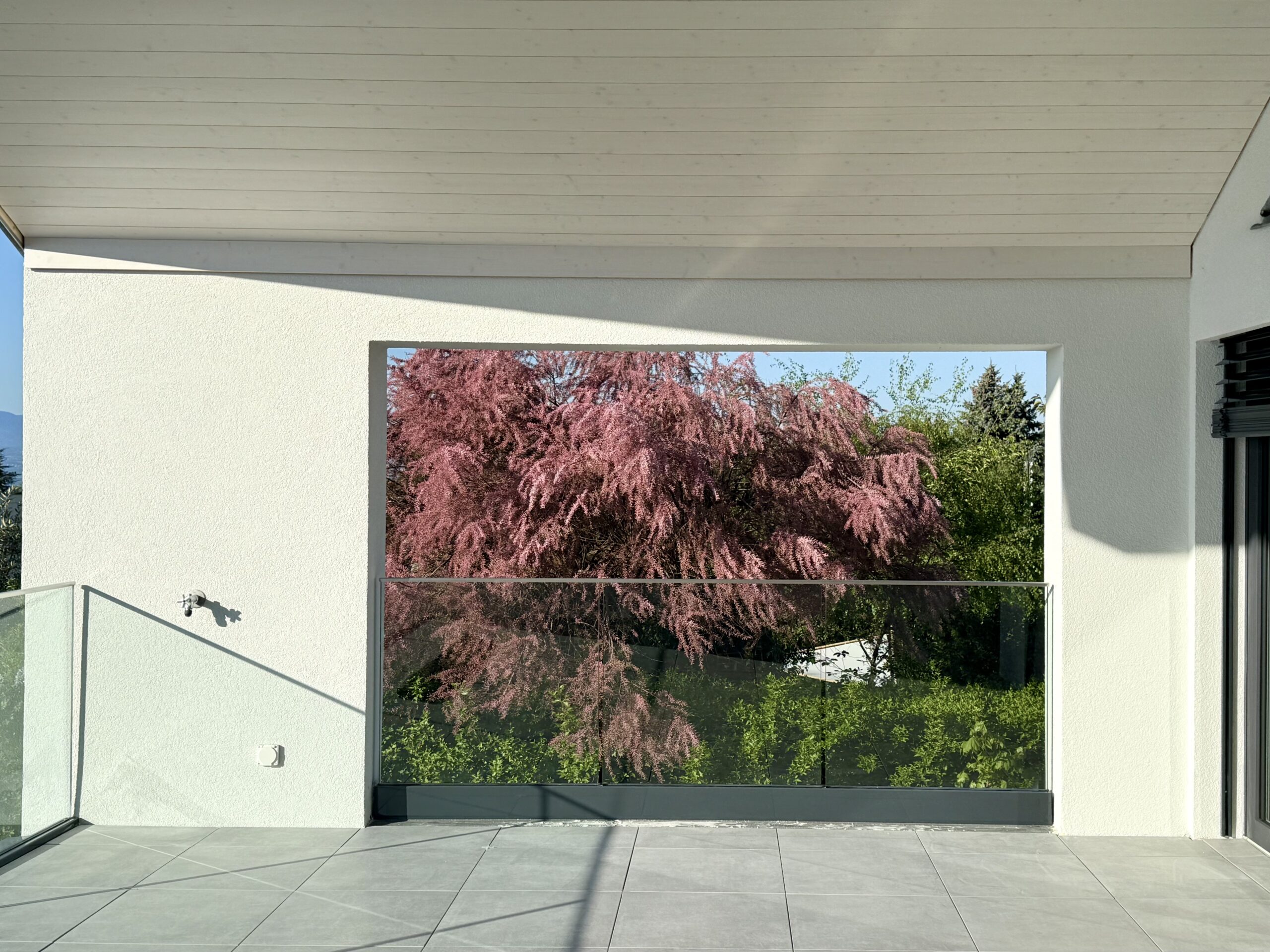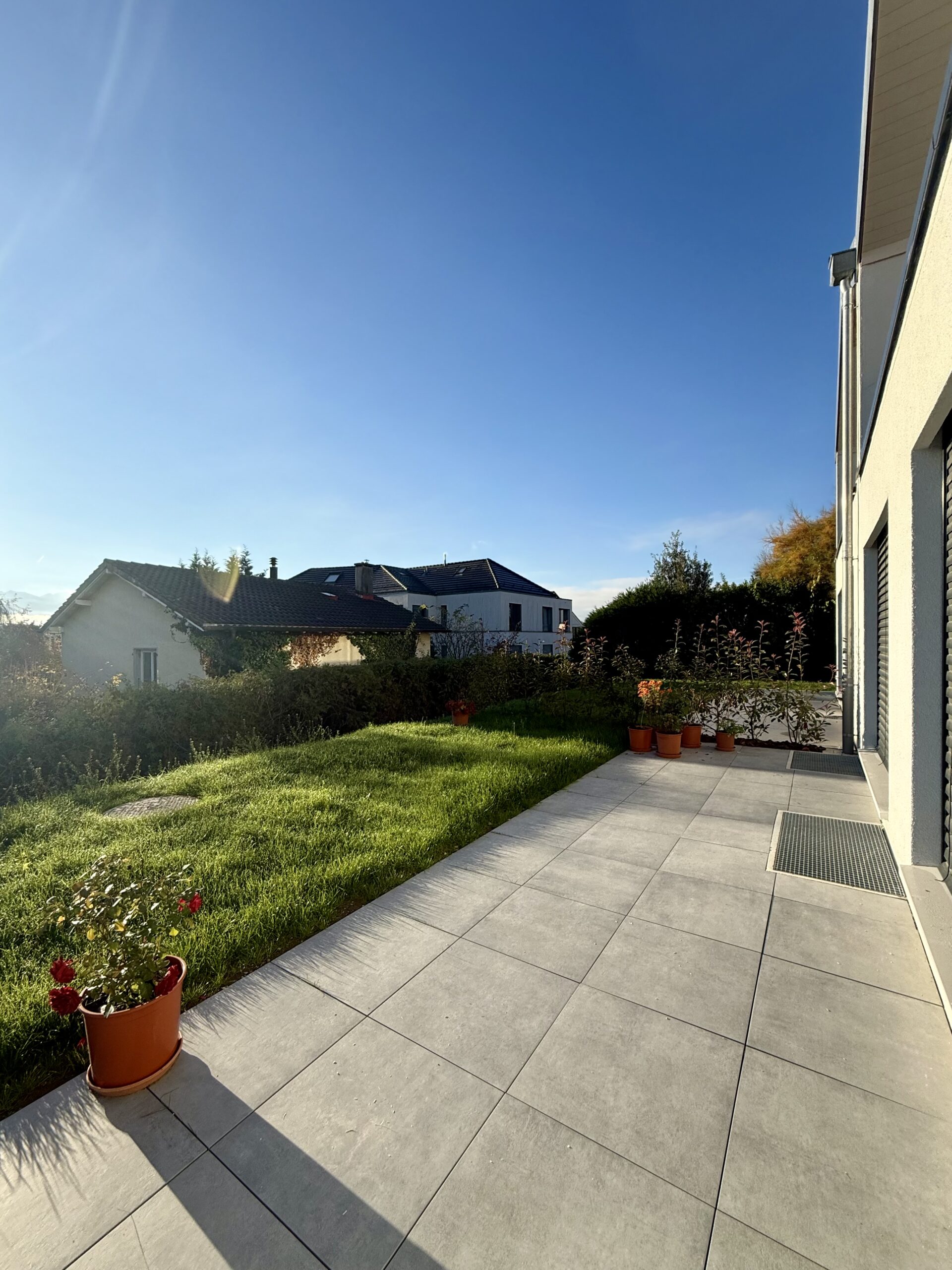 De grandes baies vitrées et une vaste terrasse ensoleillée prolongent l’espace intérieur, créant un lieu de vie lumineux, ouvert et harmonieux.