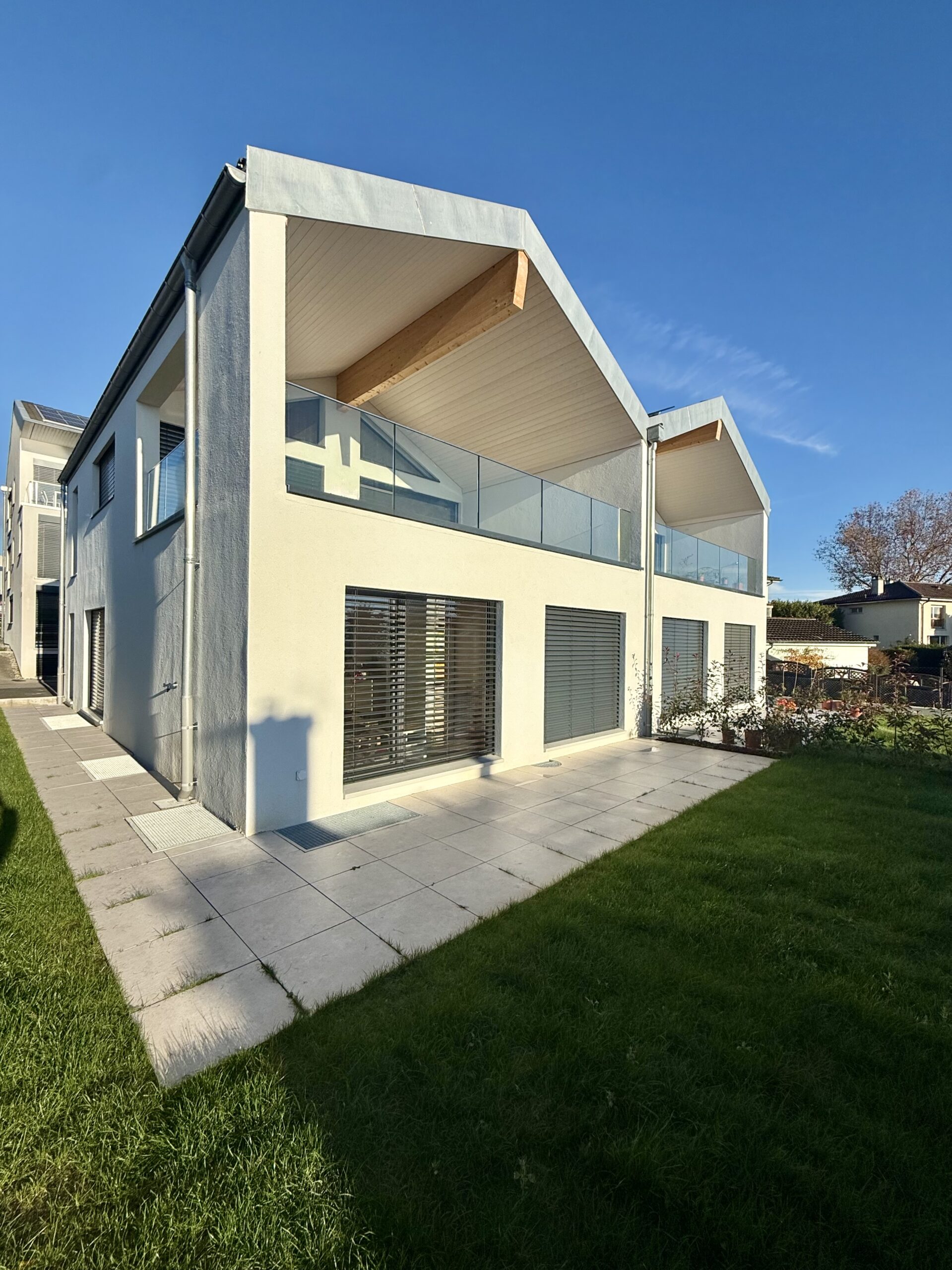 Ce projet de deux villas mitoyennes à Saint-Sulpice (VD) se distingue par une conception atypique où les pièces de vie se situent à l’étage, offrant une vue imprenable sur le lac Léman.
